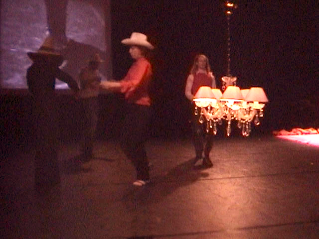 Back in the saddle-hold your horses är ett sammarbete mellan fyra dansare, en tonsättare och två konstnärer. Ett så brett sammarbete gör att mycket blir oförutsägbart. Vi har lagt focus på att försöka sammanföra våra olika uttryck på bästa sätt. Det har blivit en föreställning bestående av musik, dans och projektioner-realtids datorbearbetad video och VJ-samplingar.